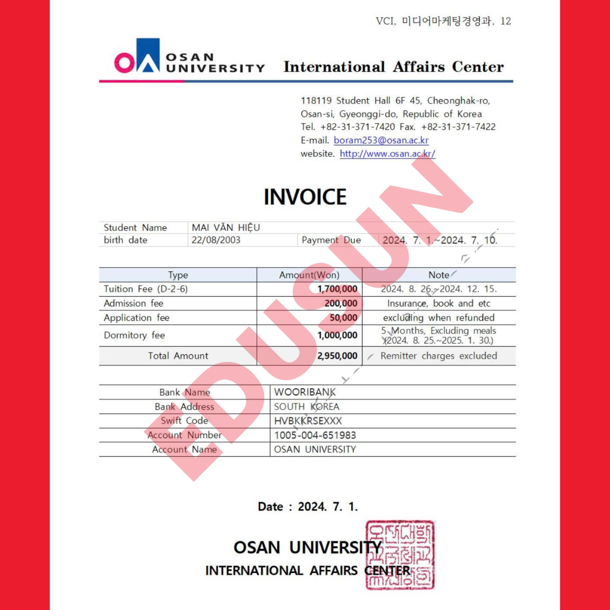 Kỳ bay nhập học D2-6 Đại học Osan đã bắt đầu dần nóng lên, các bạn học viên EduSun hiện đã nhận được invoice của Osan cũng đang chuẩn bị tâm thế sẵn sàng cho kỳ bay sắp tới đây!