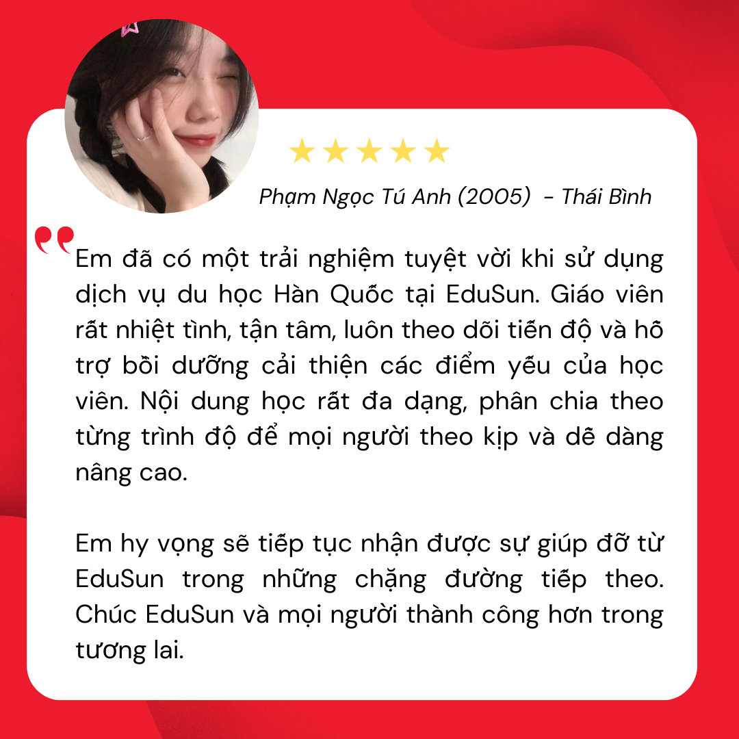 GPA 3 năm THPT trên 8.0 rất an toàn về hồ sơ học tập. Trong quá trình học tập và ôn luyện tại EduSun, Tú Anh rất chăm chỉ, đảm bảo tiến độ bài tập và kết thúc khóa học trong 3 tháng. Khi thi TOPIK, chỉ thiếu 1 điểm là đỗ TOPIK 2.