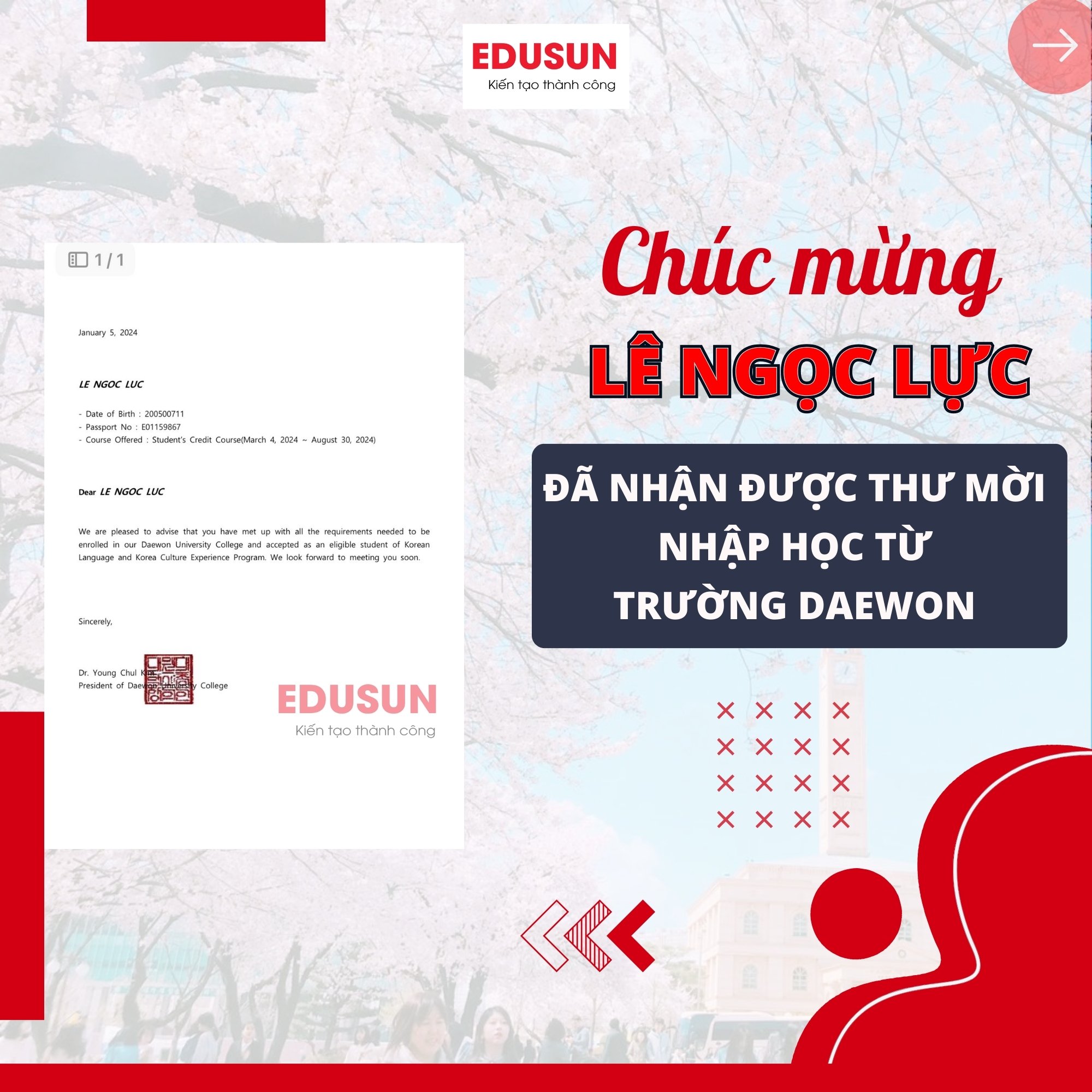 Tháng 6/2024, Học viên Lê Thị Hồng đã thành công chạm tới cánh cửa du học Hàn Quốc, xuất cảnh và nhập học trường Dongguk University – 동국대학교 , ngôi trường với chất lượng đào tạo cao tại trung tâm Seoul,